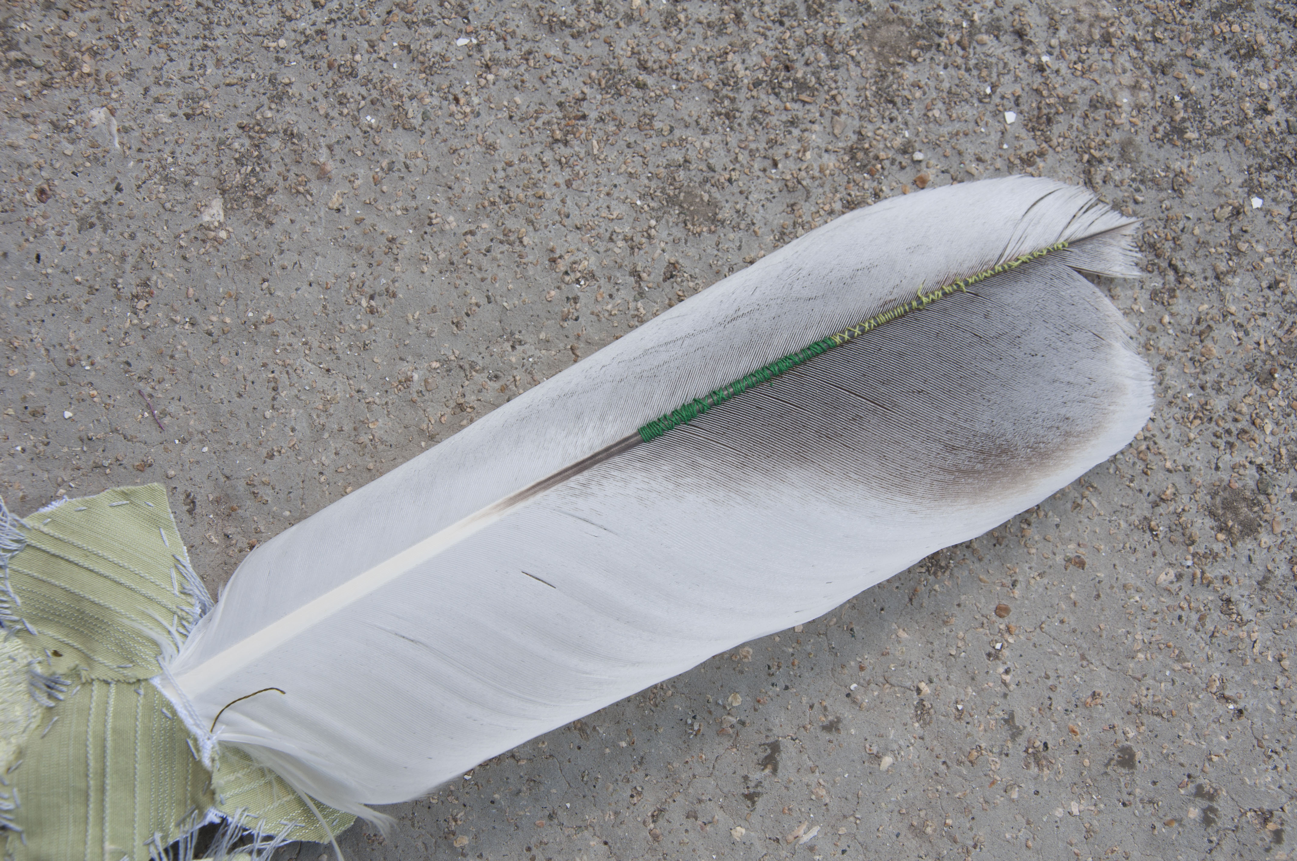 Dreamcatcher of Prespa, 2015, dimensions variable. Materials: feather of a pelican, fabric, thread, beans of Prespa.It is installed in the taverna of Christara at the village Psarades,at Megali Prespa (Great Prespa Lake). The project was part of my participation in the residence Psyche in the neck during the period 1-9 August 2015, in the Municipality of Prespa.