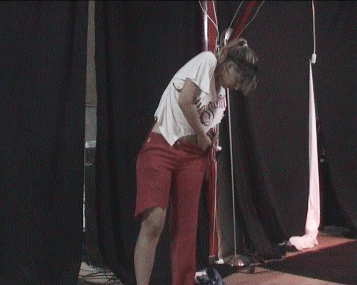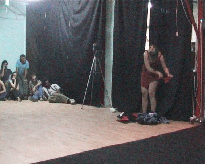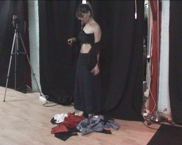 Εμφανίζομαι φορώντας κάποια ρούχα και ξεκινάω να τα κόβω με ένα ψαλίδι μέχρι να πέσουν από επάνω μου και να μείνω γυμνή. Απομακρύνομαι για λίγο από το οπτικο πεδιο των θεατών