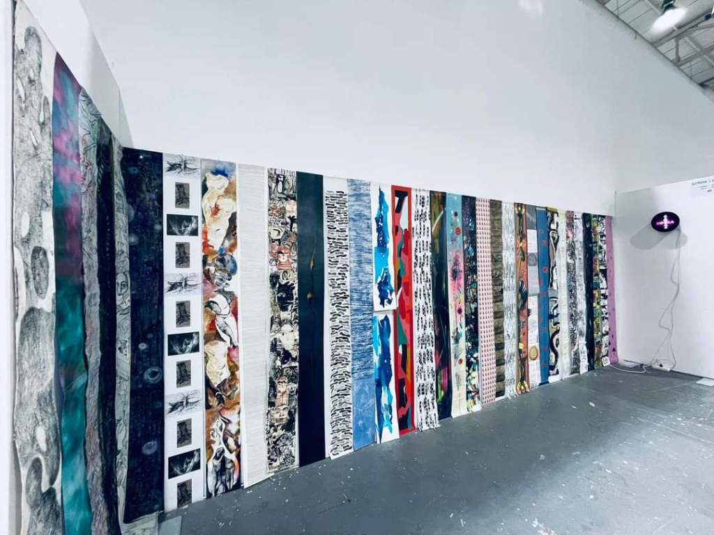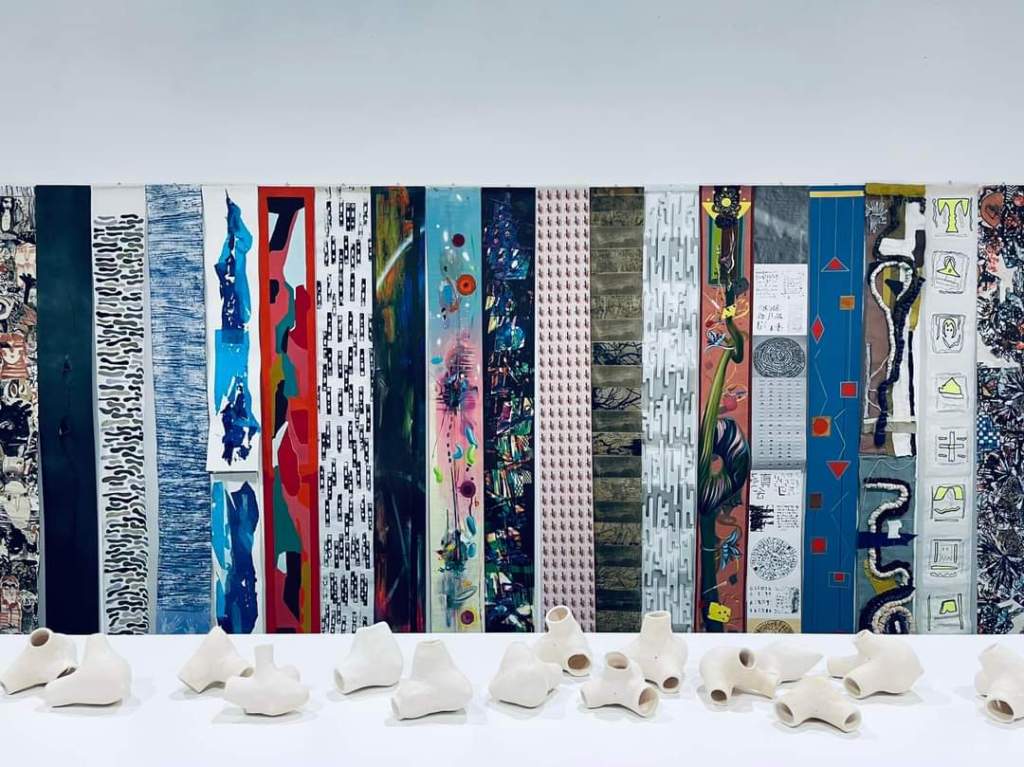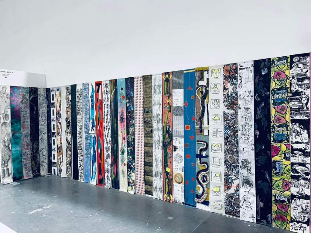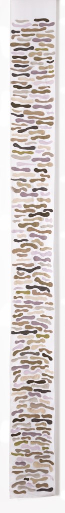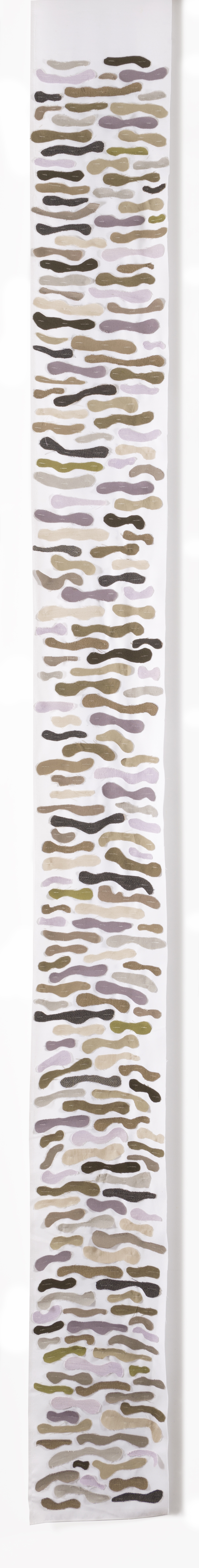 Κολώνα, 2022, διάφορα υφάσματα ραμμένα πάνω σε λευκό ύφασμα, 19×200 εκατοστά