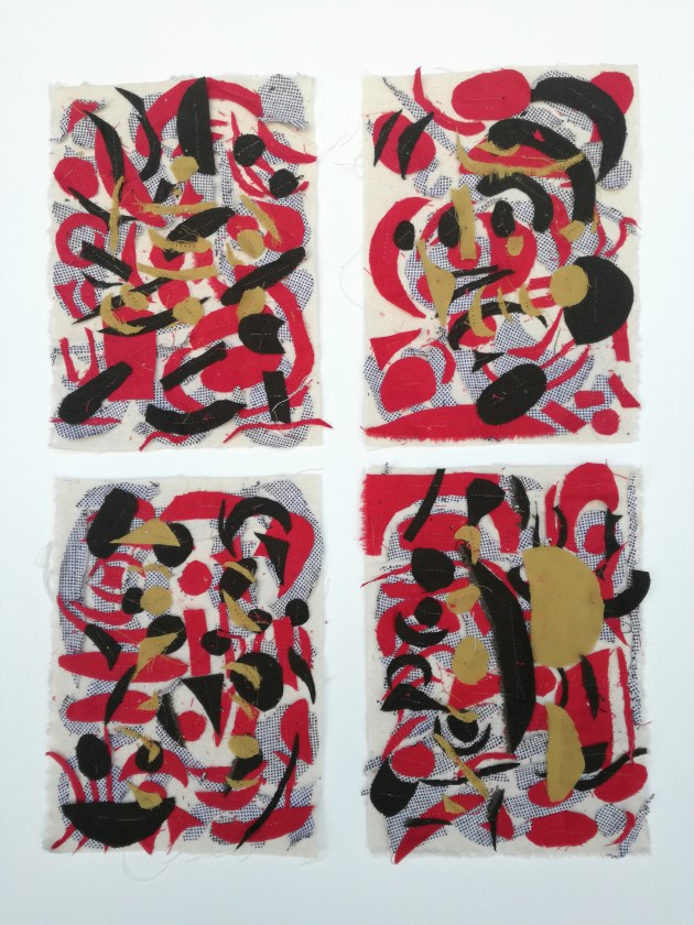 Κάρτες από ύφασμα: Συμβάν I-IV, 2018, υφάσματα ραμμένα πάνω σε καραβόπανο, 15×21εκ.