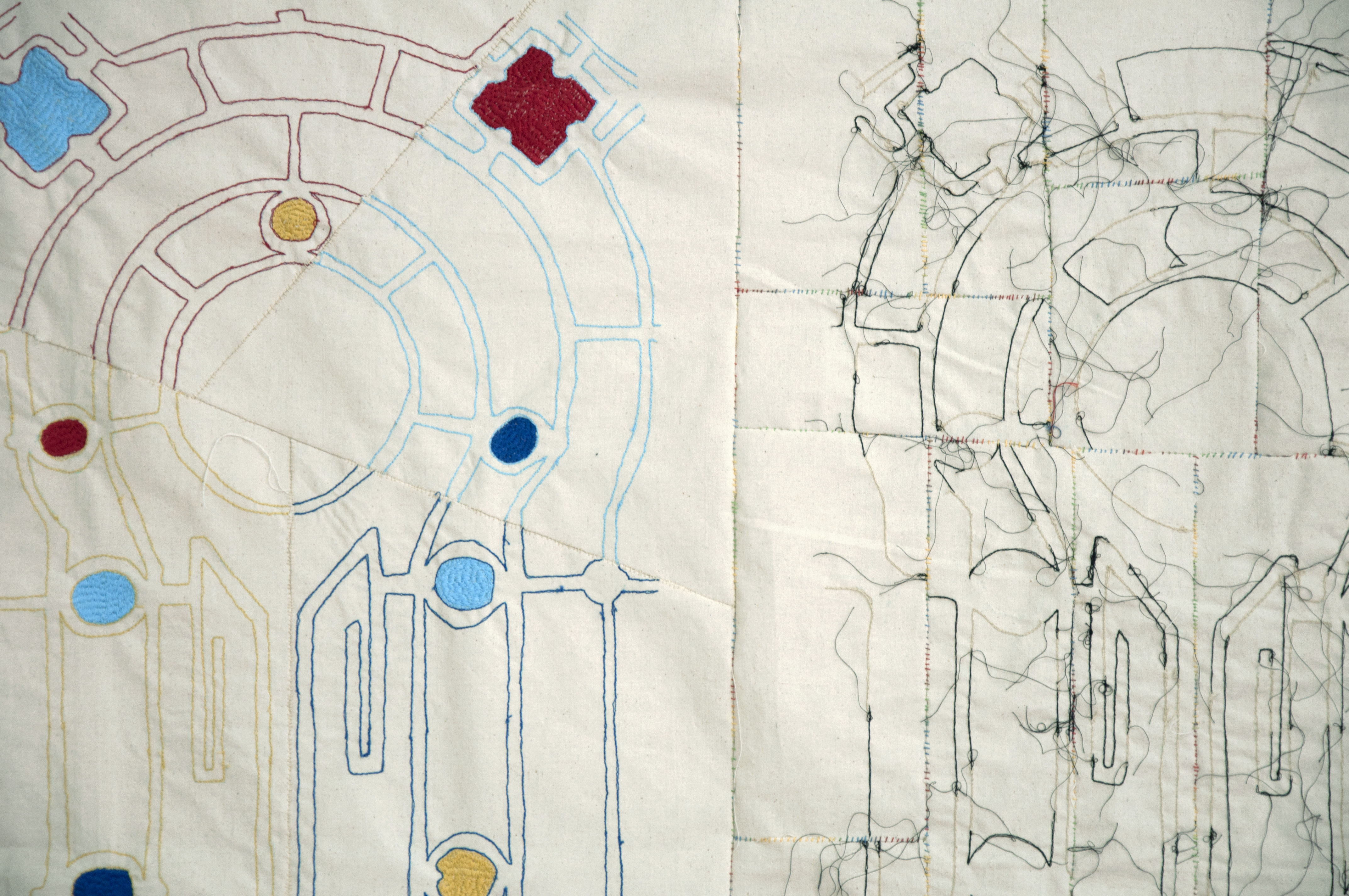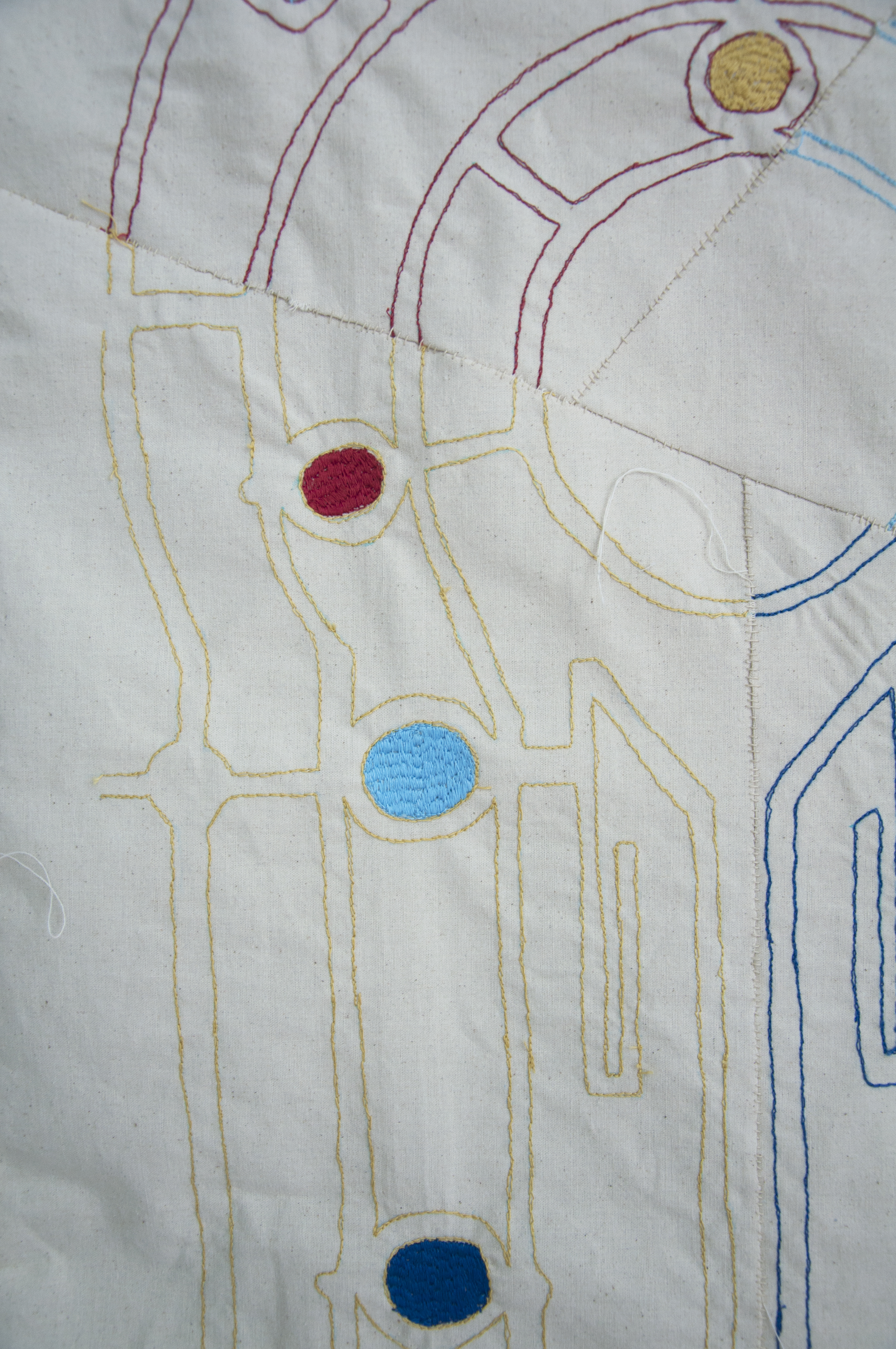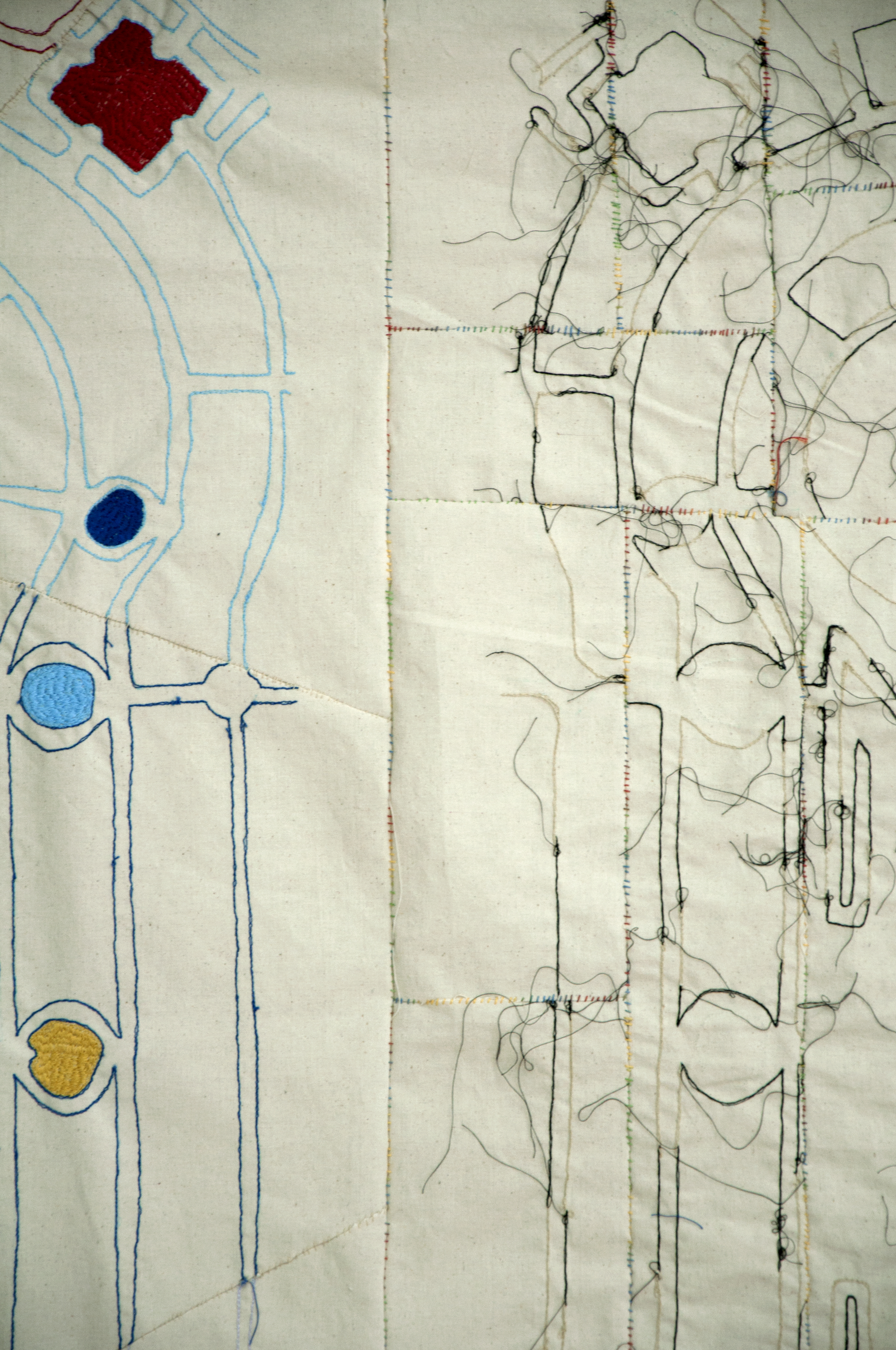 Then, through the cardboard boxes I take out small pouches and I stay with a colorful garment that I have made (the artwork Χαρά | Joy). Over me are hanging four pouches with different materials: stones, shells, small children’s drawings and extracts from the chiefs speeches about the quiet life of the brothers of the many islands, that I’ve coppied into small pieces of paper and have over-painted.