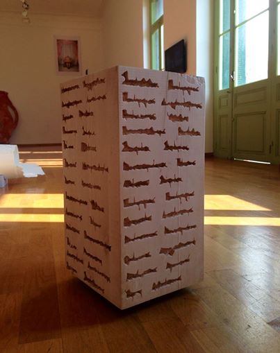 For their well being, 2014, names carved on wood wood, 48,5 x 27,3 x 23,7 cm.