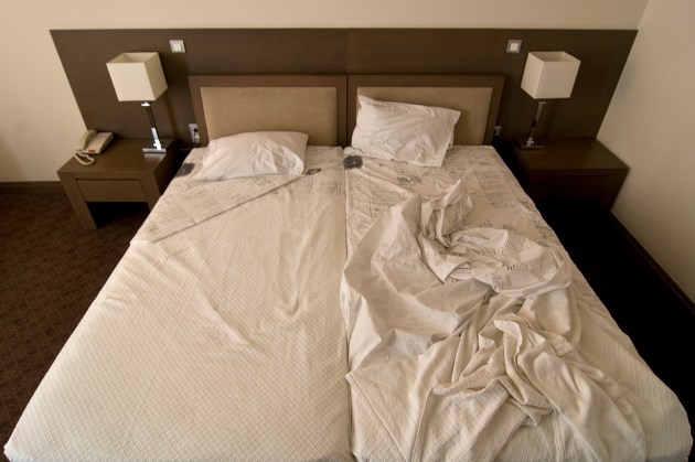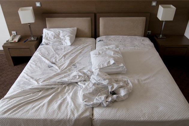 The project: The bed sheet / diary, invitation for contact was carried out as an interactive installation at 1,2 and 13 and June 14, 2011 in rooms of Athens Amalia Hotel in Syntagma, in Athens and 6 persons participated spending their night, there.