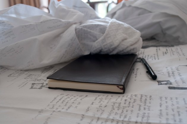 All the pages of my diary revealed over the sheets of a bed and are offered to the participant to sleep and experience with his/her own body and senses, something so personal. Part of the project is for him/her to write something personal into the pages of a notebook lying in the room in response to this invitation for contact and communication.