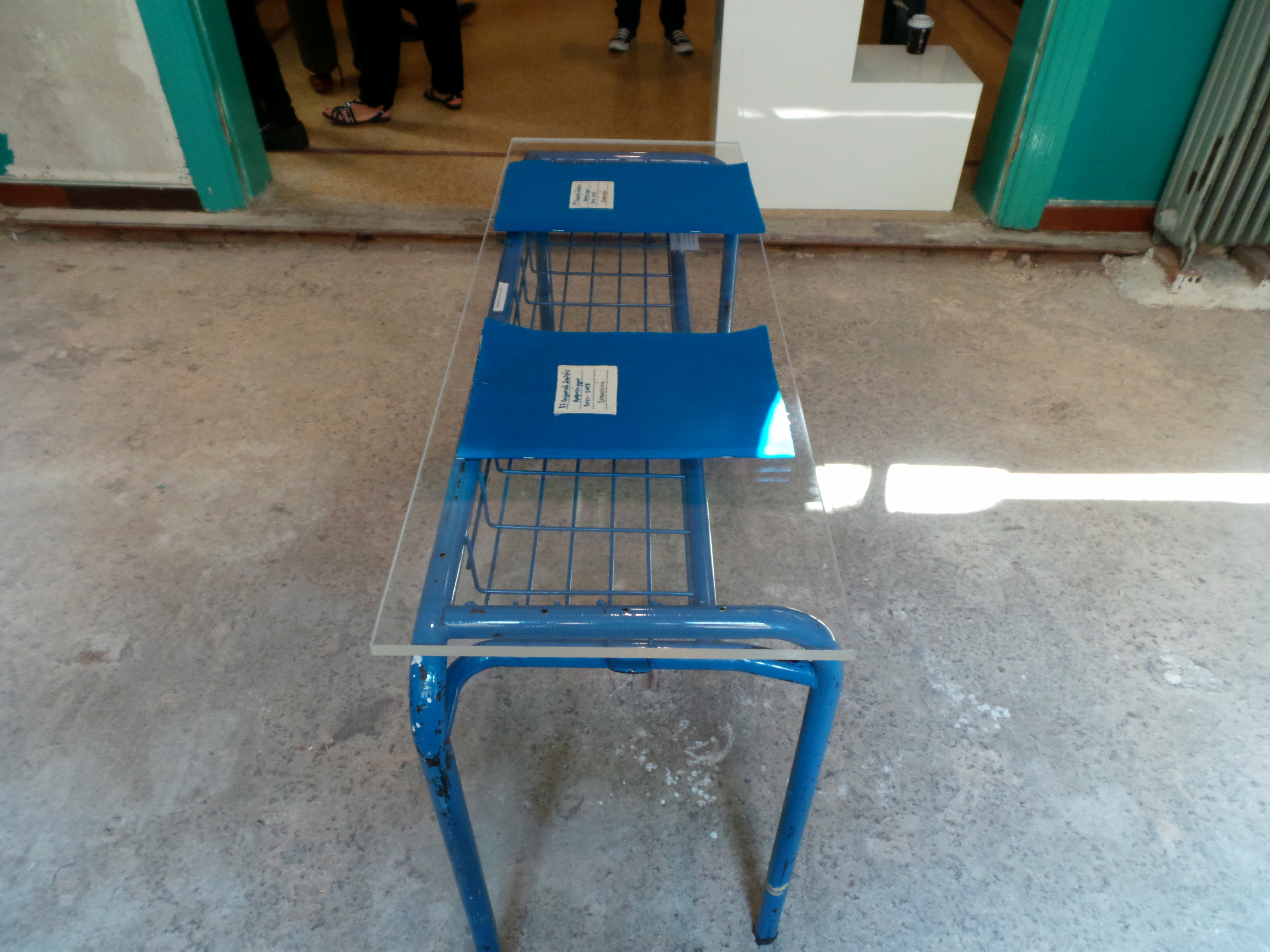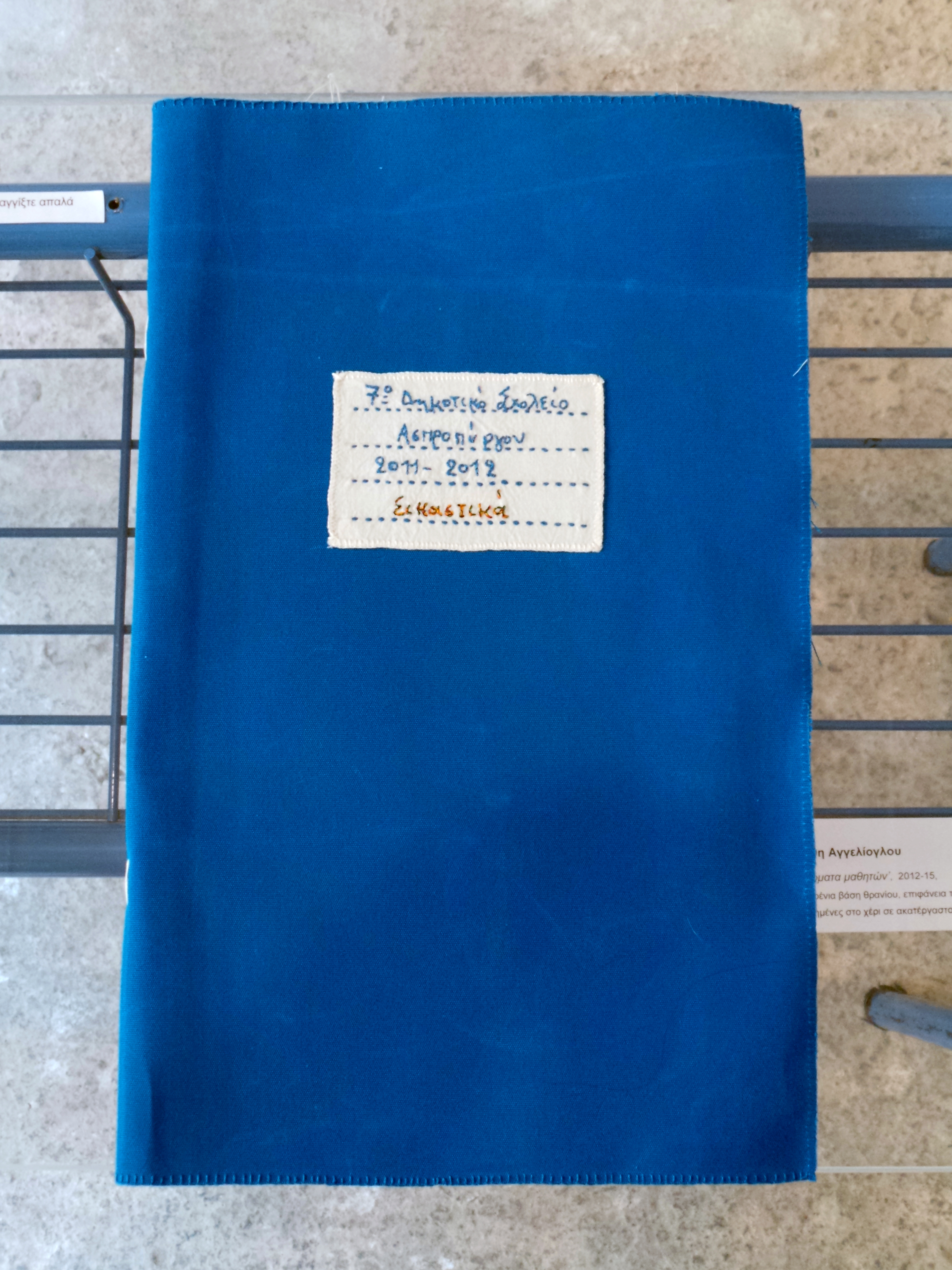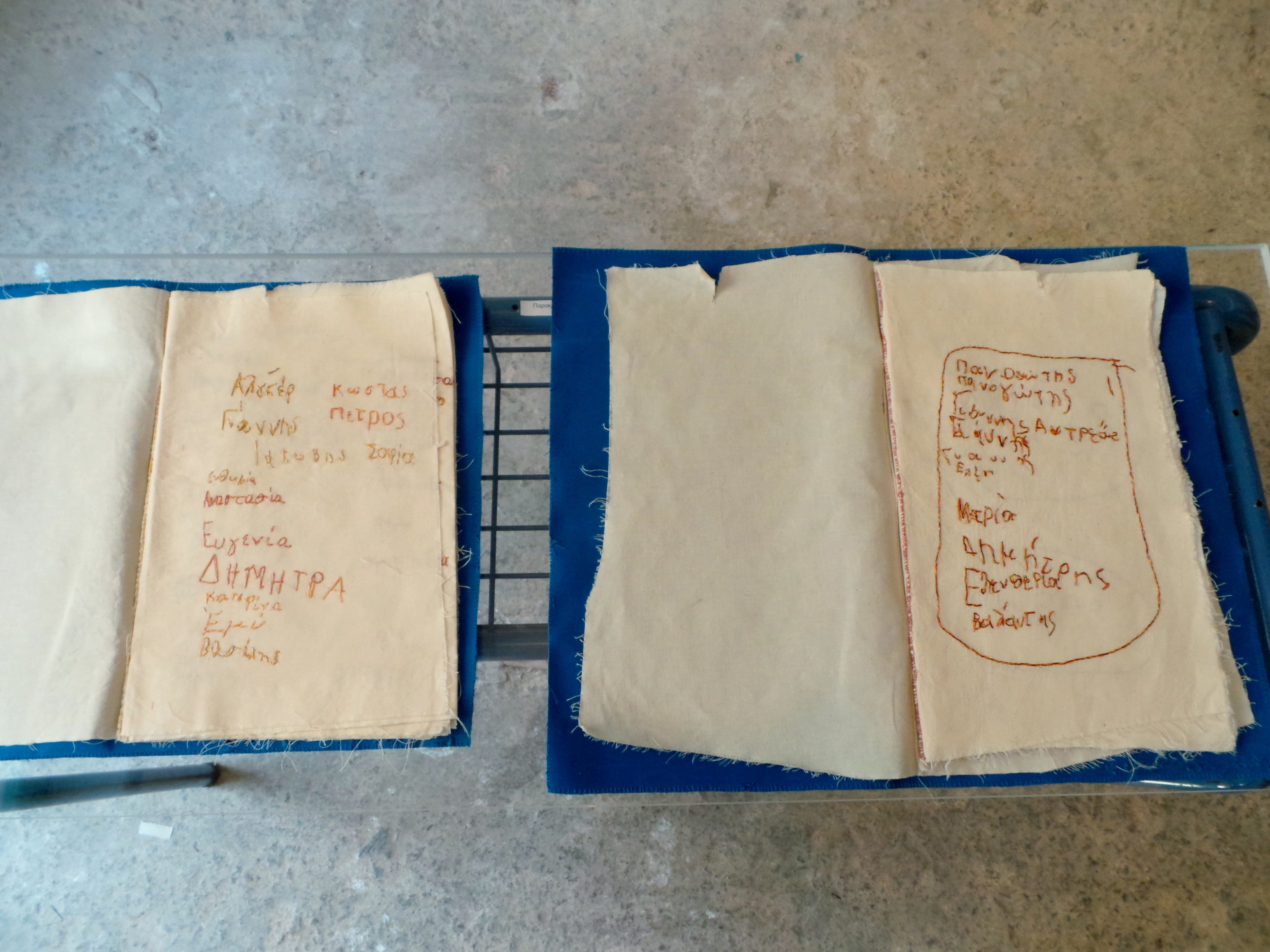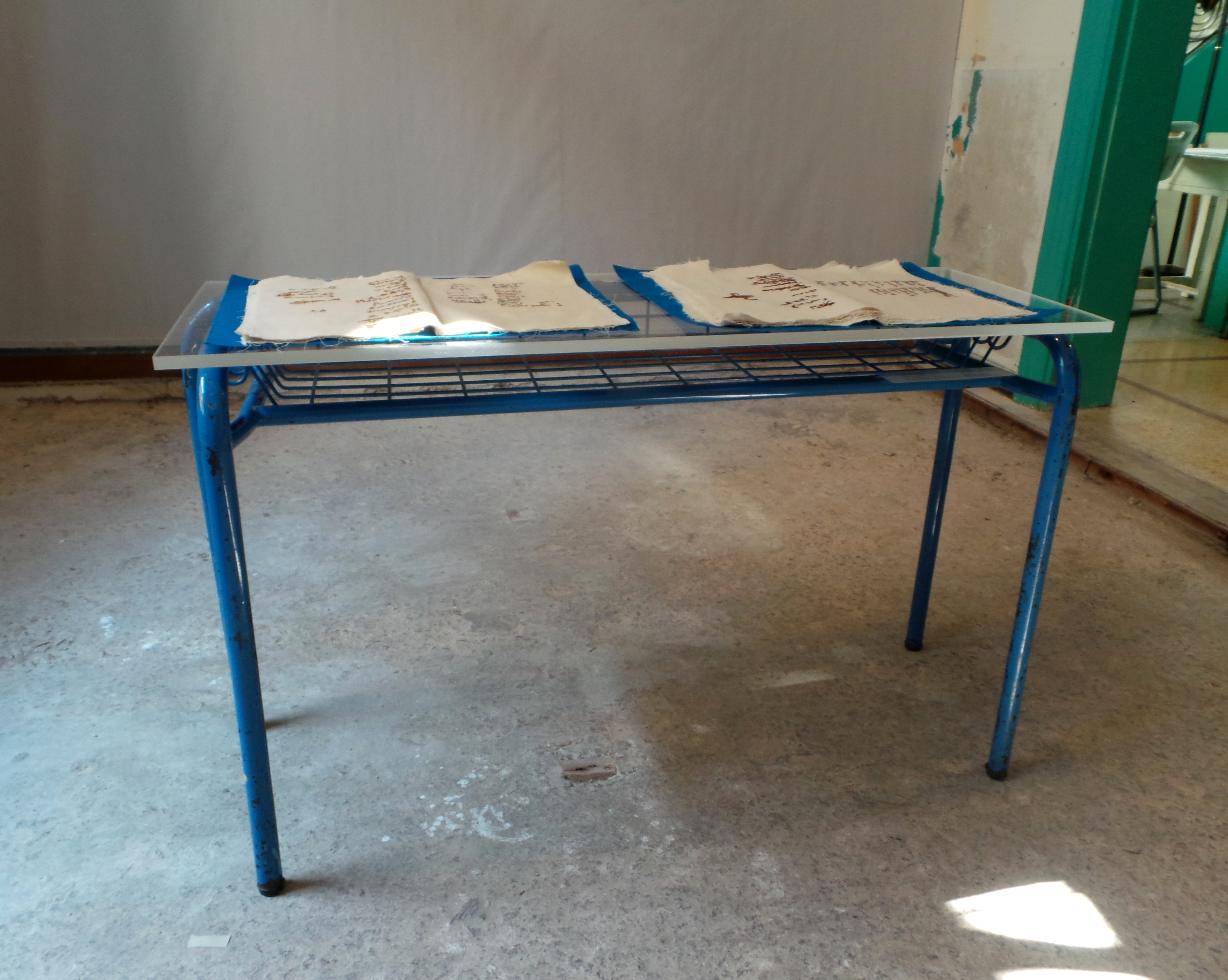 Ονόματα μαθητών/ παρακαλώ αγγίξτε απαλά, 2012-15, εγκατάσταση, σιδερένια βάση θρανίου, επιφάνεια πλεξιγκλάς και 2 τετράδια από ύφασμα, κεντημένα στο χέρι με βαμβακερές κλωστές σε ακατέργαστο βαμβακερό ύφασμα, 32×25 και 42×26 εκατοστά. Εγκατάσταση στο Bhive/ pop up project space